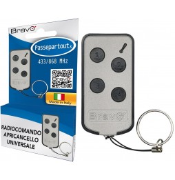 14,90 €Il **BRAVO PASSAPARTOUTX** è un radiocomando universale auto-apprendente a **4 canali**, in grado di duplicare la maggior parte dei telecomandi per cancelli e garage che operano sulle frequenze **433MHz e 868MHz**. Mantiene la memoria anche nel cambio batterie ed è dotato di pila **Energizer** inclusa.