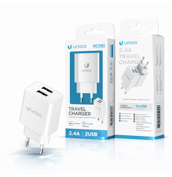 Il caricabatteria da casa di Unico rappresenta una soluzione affidabile ed efficiente per l'alimentazione quotidiana dei tuoi dispositivi elettronici. Grazie alla presenza di una doppia porta USB-A, questo alimentatore permette di ricaricare contemporaneamente due apparecchi, ottimizzando i tempi e garantendo un'uscita d'energia sempre stabile. Realizzato in materiale ABS di alta qualità, il dispositivo vanta una struttura resistente all'usura e alle cadute, assicurando una lunga durata nel tempo e una protezione costante per i circuiti interni, il tutto racchiuso in un design bianco essenziale e professionale.