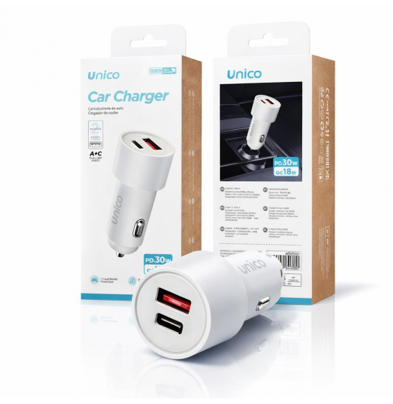 Dotato di due porte indipendenti, il caricatore UNICO garantisce la massima versatilità: la porta Type-C eroga fino a 30W (PD), ideale per caricare rapidamente iPhone, smartphone Android di ultima generazione e persino tablet. La porta USB-A supporta la tecnologia Quick Charge fino a 18W, assicurando una ricarica rapida anche per i dispositivi più datati o accessori come navigatori e auricolari Bluetooth. La combinazione delle due porte permette di alimentare due device simultaneamente senza cali di prestazione significativi.